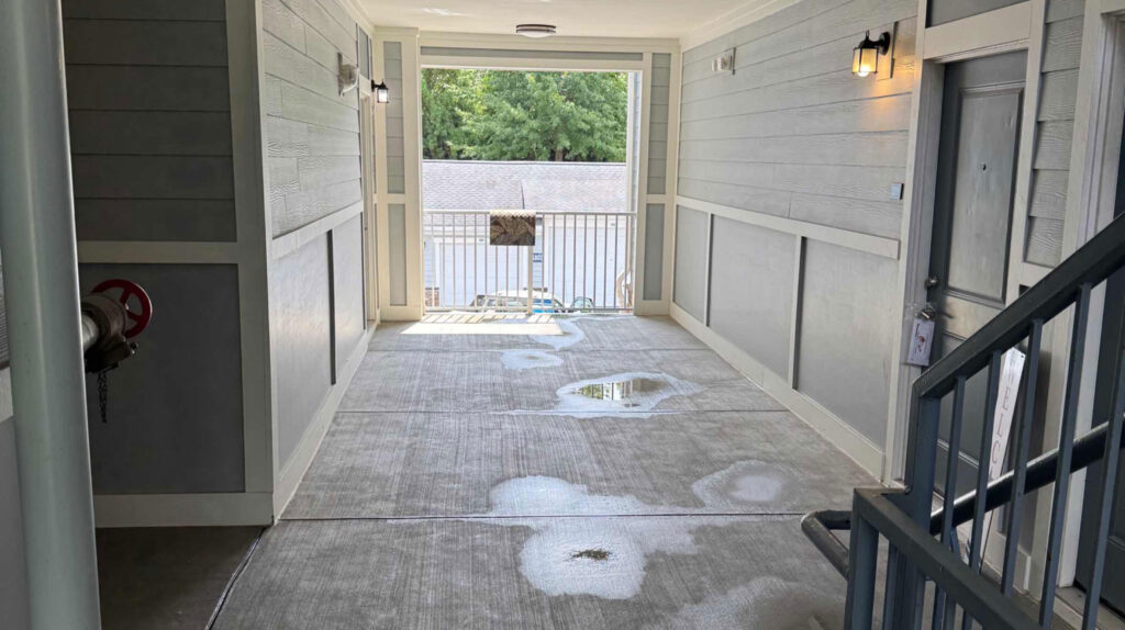 Sometimes jobs aren’t as simple as pressure washing concrete. For the Element Ballantyne apartment community, we took special pains on the prep work for breezeway cleaning. The team wrapped all sensitive electronics — including pull stations and fire panels in FACP rooms — with plastic wrap and duct tape and took pictures to document their condition before cleaning. Technicians soft washed the interiors of breezeways, downstreamed bleach and surface cleaned all flatwork, pretreated FOG (fat, oil, grease) stains with HSR with X-jet pressure washers before cleaning them with hot water, and squeegeed the floors to prevent water buildup.